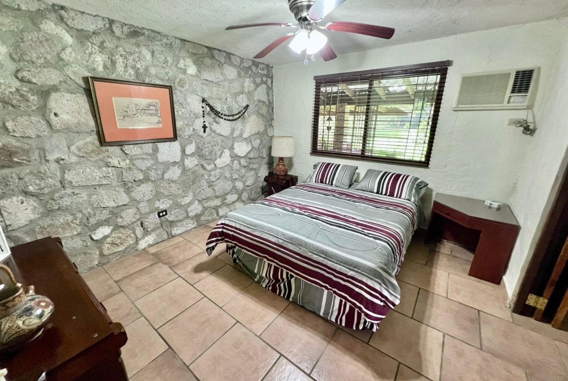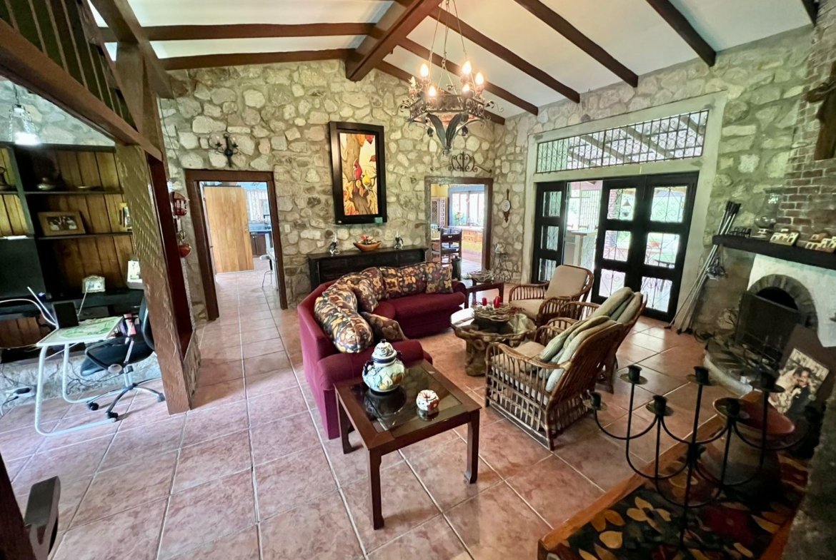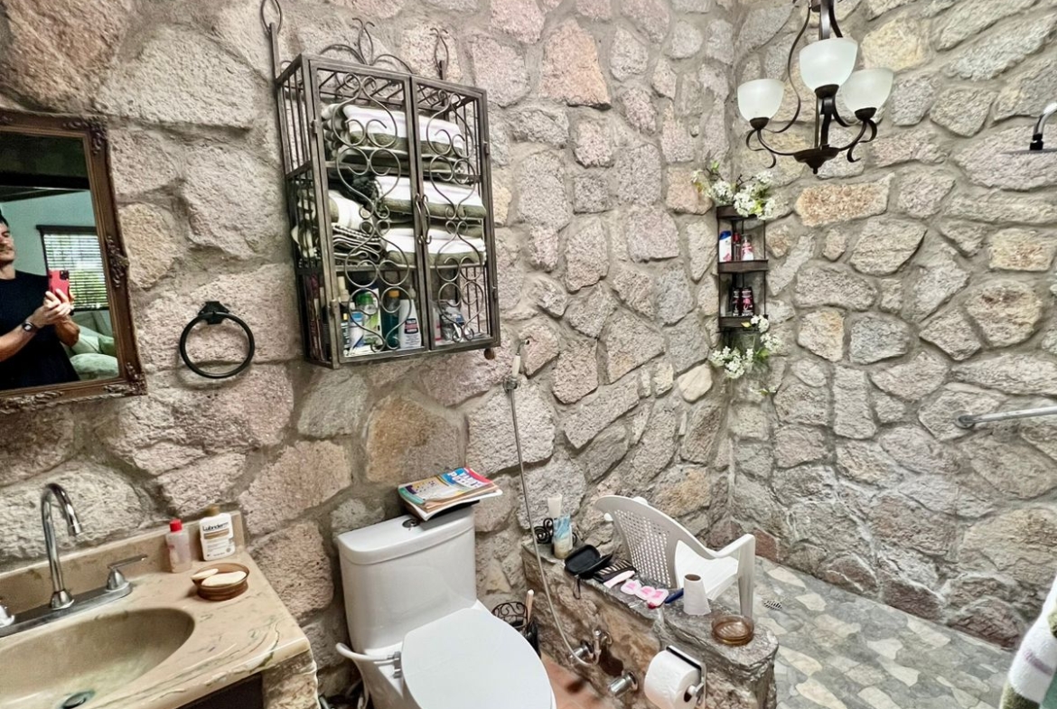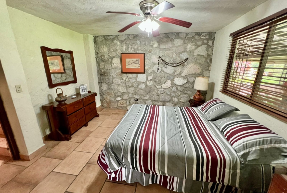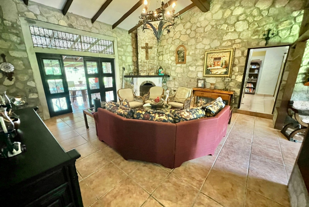 La propiedad cuenta con una piscina, una casa principal de 5 recámaras y 4 baños con acabados de piedra en las paredes, una casa adicional de 3 recámaras y 2 baños, una caseta de cuidador y una plaza de estacionamiento.