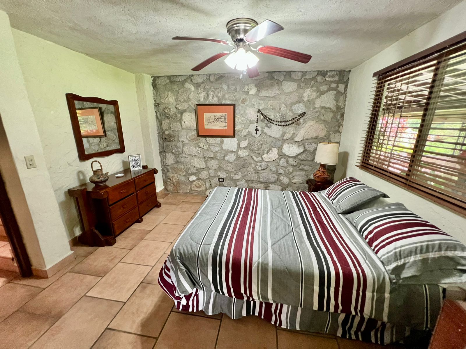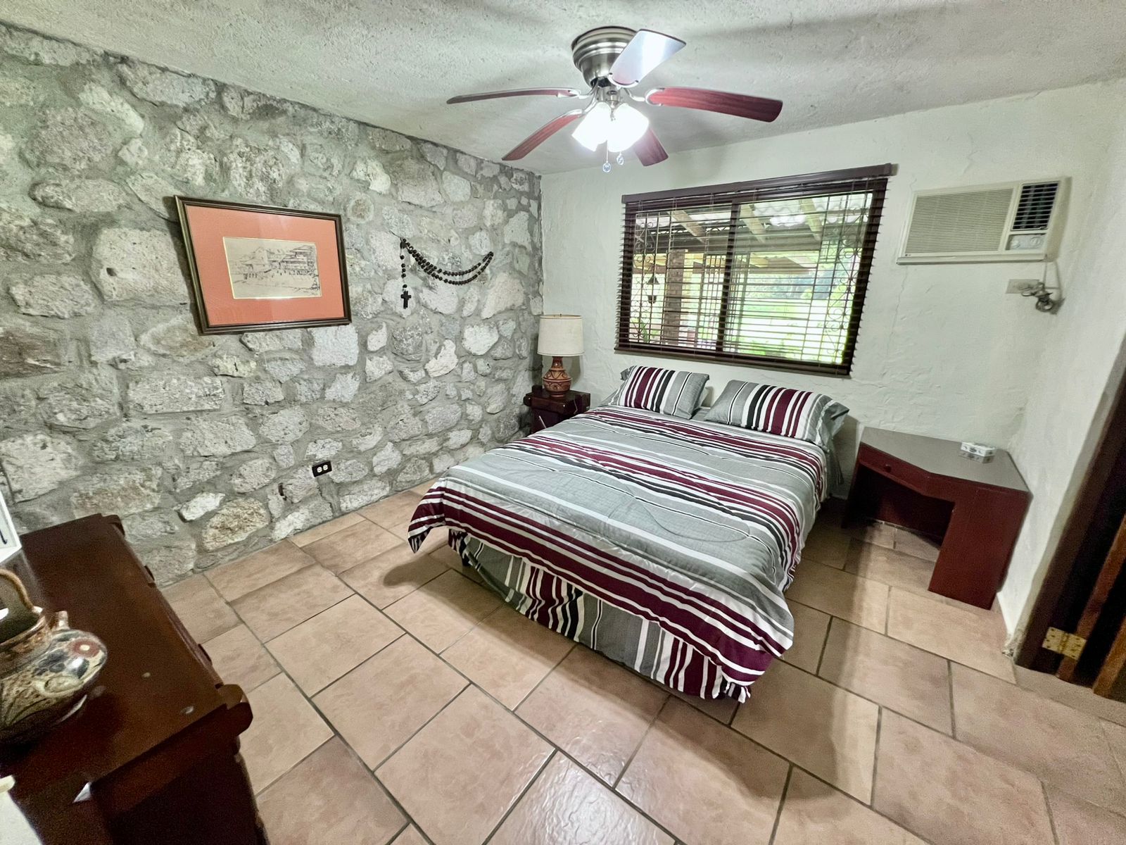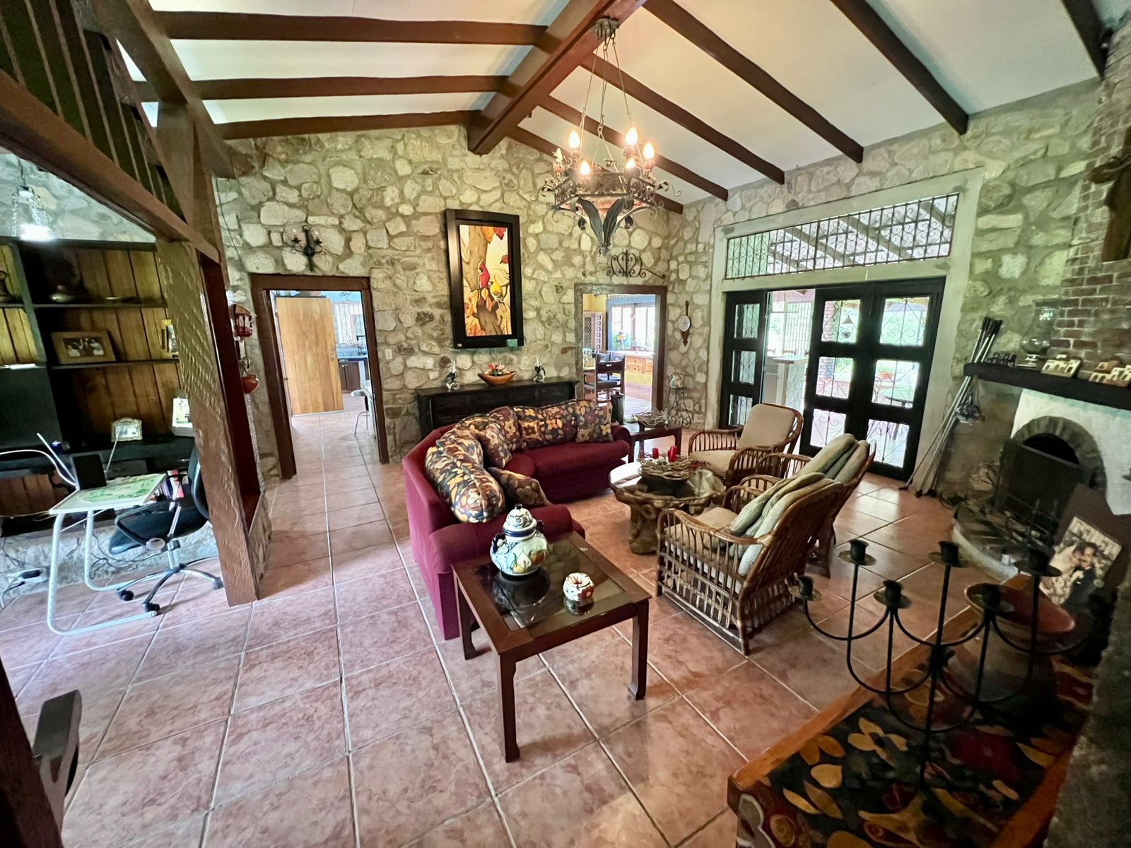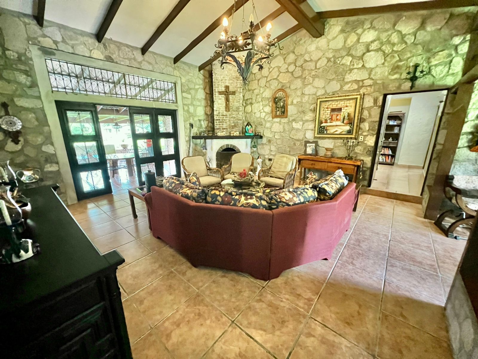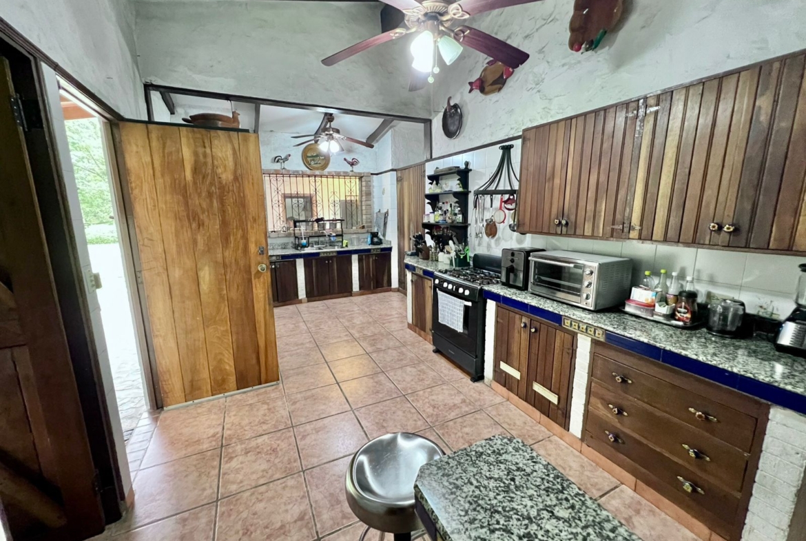 La propiedad cuenta con una piscina, una casa principal de 5 recámaras y 4 baños con acabados de piedra en las paredes, una casa adicional de 3 recámaras y 2 baños, una caseta de cuidador y una plaza de estacionamiento.