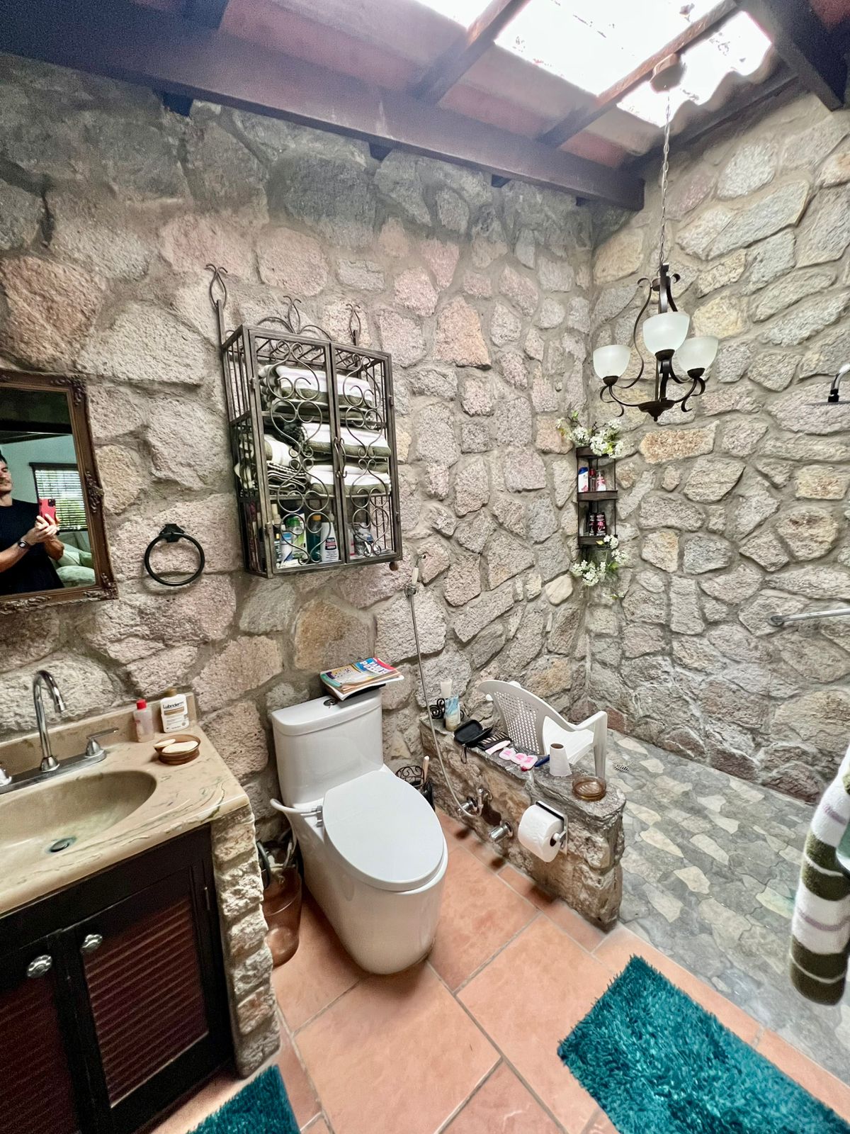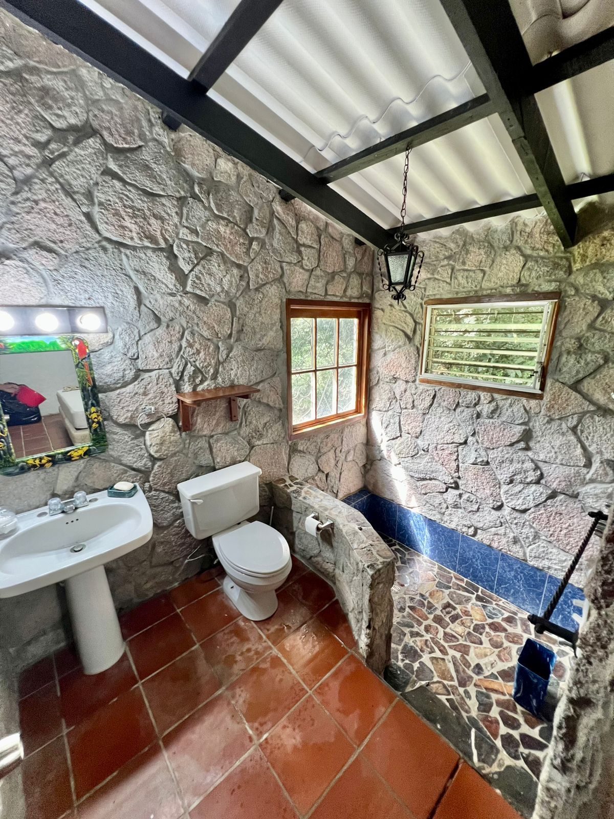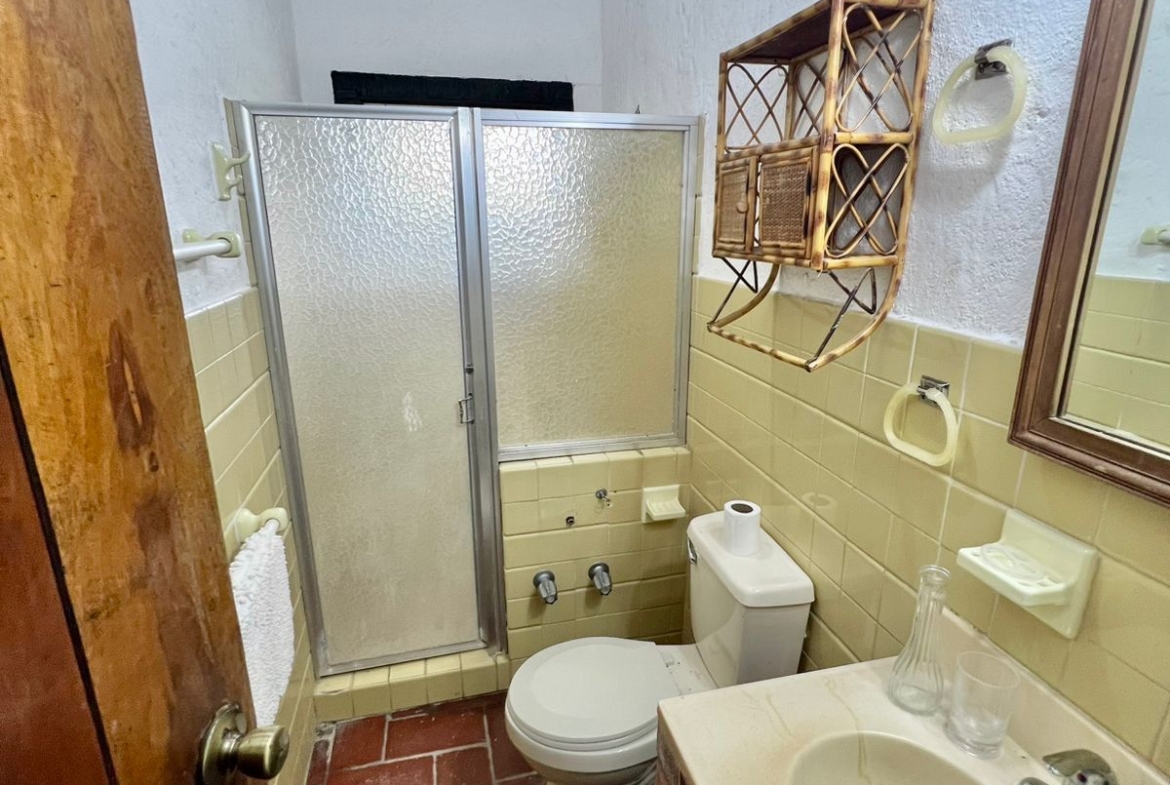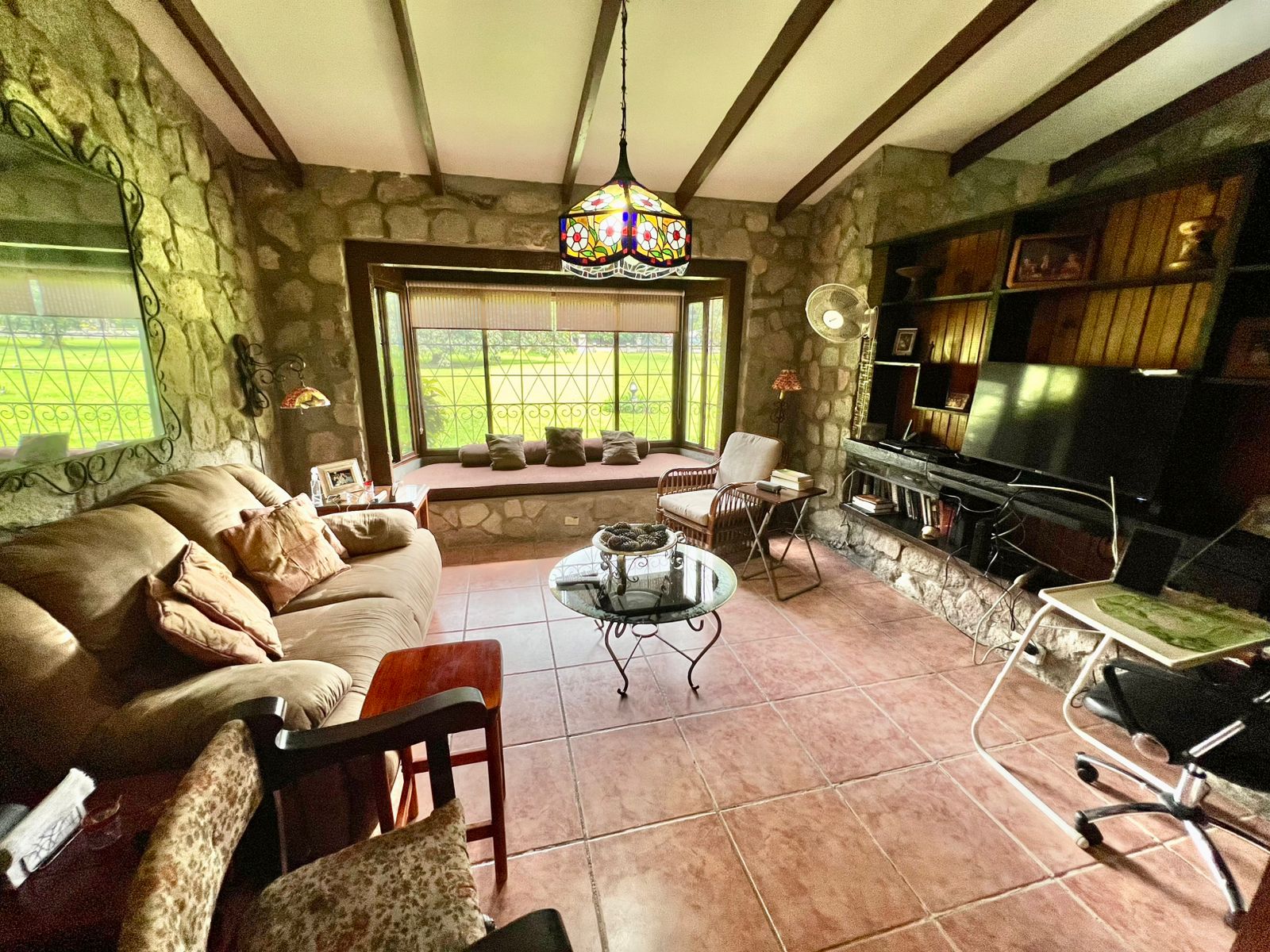 La propiedad cuenta con una piscina, una casa principal de 5 recámaras y 4 baños con acabados de piedra en las paredes, una casa adicional de 3 recámaras y 2 baños, una caseta de cuidador y una plaza de estacionamiento.